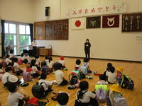 小学校生活で大切にしてほしいこととして、「大きな声であいさつをしましょう」「話を聞くときは、話している人の顔を見て聞きましょう」「自分と同じように、友だちを大切にしましょう」という3つのお願いをしました。