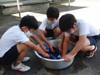6年生の家庭科で「夏をすずしく さわやかに」という単元で、自分の衣服を洗濯する学習があります。例年、校長室から見える場所で手もみ洗いの学習が行われています。本日、6年生の子どもたちが自宅から持ってきた洋服を洗っていたので、学習の様子を見せてもらいました。日頃、洋服を手洗いするという経験はほとんどないため、どの子も楽しそうに、そして悪戦苦闘しながら学習に取り組んでいました。