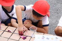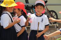 1年生の生活科で「なつとあそぼう」という学習があります。毎年、この活動をするときは、校長室から見える手洗い場の近くで楽しく学習している様子が見えます。子どもたちが楽しそうに学習していると、ついつい写真を撮りたくなってしまいます。本日、「1年生の「なつであそぼう」の学習が行われました。シャボン玉で遊んだり、アサガオで水を染めたりする活動が行われていました。大変蒸し暑い気候でしたが、1年生の子どもたちは、ニコニコしながら活動を楽しんでいました。家から持参したものを自分だけで楽しむのではなく、友だちにも貸して、一緒に遊ぶ姿を微笑ましく感じました。
