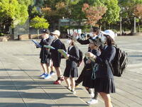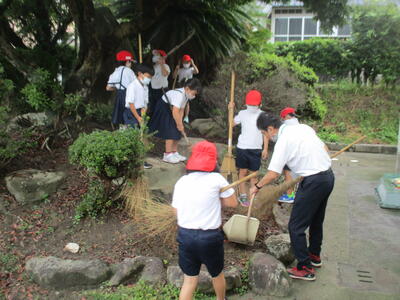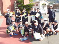 翌日の2日(金)の朝,登校後すぐに1年生や2年生の子供たちがホウキや熊手を持って,校門付近を掃除してくれました。そんな子供たちを「ホーキーズ」と名付けました。