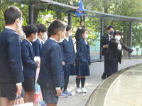 町内の都呂々小学校の6年生と連合で、長崎県・佐賀県方面に修学旅行に出かけます。まだ薄暗い時間の集合でしたが、全員元気に集合しました。家族の方々に大きく手を振って、張り切って出発しました。昨日の夜は雨が降っていたのですが、子どもたちの願いが届いたのか、快晴の一日目となりました。