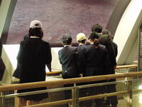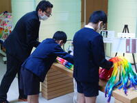 その後、場所を国立追悼平和記念会館に移し、平和集会を行いました。全員で黙祷を行った後、協力して作り上げた千羽鶴を捧げました。会館の方からの説明から、原子爆弾の被害で亡くなった多くの方々の名前を記した名簿を実際に目の当たりにし、驚いていました。