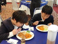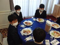 本日の活動を終え、午後5時30分に宿泊先に到着しました。そして、子どもたちが待ちに待っていた夕食の時間になりました。チョコレートタワーを楽しみにしていた子も多かったようです。出された食事を残すことなく、きれいに平らげました。笑顔で食事を楽しむ様子が見られ、食事を準備してくださるホテルの方々や添乗員さんも、子どもたちをうれしそうに見つめられていました。