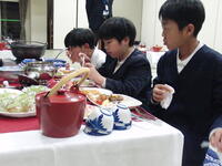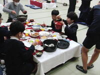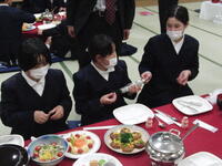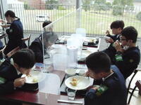 この日の給食はお祝いメニュー。1年生ももりもり食べていました。