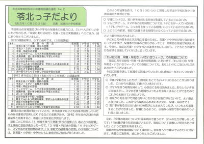 苓北っ子だよりNo.2を配付しています。保護者の皆様にご協力いただいた「家庭における幼児・児童・生徒の実態調査」「れいほく町 早寝・早起き・いきいきウィークでの取組」についての報告です。ご一読ください。