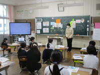 苓北町の児童や生徒の栄養指導や管理を担当されている栄養職員の方を本校にお迎えし、学校給食共同調理場で働かれている方々の仕事や毎日の給食ができるまでの様子について話していただきました。5校時に1・2年生、6校時に3・4年生に向けて写真等を見せながら詳しく説明していただきました。共同調理場で実際につかられているたくさんの機械を紹介されましたが、子どもたちは、大変興味をもったようでした。また、働かれている方々が暑い日も寒い日も自分たちのために給食を作ってくれていることを知り、改めて感謝の気持ちを高めていたようでした。