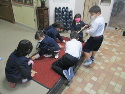 今日は職員玄関前がにぎやかだと思って見てみると、2年生の子どもたちが、ガムテープを使って玄関マットをきれいにしてくれていました。砂ぼこりがテープにくっつくのが楽しかったのか、夢中で作業していました。