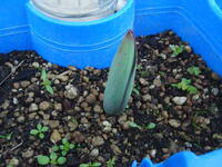 「わあ、また大きくなってる。」「○○ちゃんのは、大きいよ。」最近の1年生の関心事は、一人一鉢で植えたチューリップの生長のようです。正門で「おはようございます」の一礼をすると、すぐに鉢の近くに行って確かめています。土日は温かくなりましたので、先週よりも土の上に伸びた葉の部分が大きくなっていたようでした。昨晩雨が降ったにもかかわらず、やはり水やりをしていました。その中の一人が、「あんまり水をあげると、お腹いっぱいになっちゃうよ。」と話していました。そんな子どもたちの会話を聞いていると、私も春が待ち遠しくなりました。