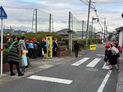 本校では、毎月5のつく日を「ごあいさつ運動」を行う日と位置付け、子どもたちの「あいさつ」を交わす力の向上と交通安全への意識を高める取組を続けています。保護者の方々にご協力いただき、通学路の要所で、登校する子どもたちや地域の方々へ「おはようございます」と、あいさつの声をかけてくださっています。以前は、地域の方々や本校の卒業生の保護者の方も一緒に取り組まれていましたが、新型コロナウイルス感染症の流行に伴い、地域学校協働活動「すくすく芽生えの会」で話し合い、現在の形で継続しています。すくすく芽生えの会の「チームたくましく」で支援していただいている方々は、本年度作った本校オリジナルの帽子をかぶり、子どもたちの登校や下校の様子を見守っていただいています。