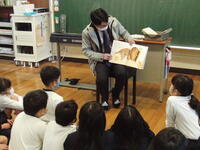 本日は、朝の時間を使って読み聞かせを行う日でした。本校の読み聞かせは、その学級の担任以外の職員が訪れる教室の子どもたちのことを考えて本を選び、お話をするようにしています。子どもたちの様子を見るために各教室を回っていると、2年生教室から歓声が聞こえます。だれが、どんなお話をしているのだろうと教室に入ってみると、本校の教頭先生が何種類ものきょうりゅうが登場する絵本を使って、子どもたちの視線を釘付けにしていました。教頭先生がユーモアたっぷりにお話を進め、その展開に子どもたちの笑い声が教室中に溢れていました。