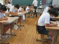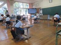 問題用紙を撮すことができないため、遠くから様子の紹介です。この調査は、学校で習ったことを使って、回答するものがたくさんあり、何を答えるのか、どんな式をたてるのか、どの性質を使うのかなど、回答形式も様々です。調査が終わって自分がまだ学習を進めなければならないところが分かったと思います。自計学や日々の学校での学習で取り組んでいきたいと思います。