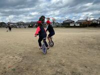 練習の成果で長い距離を乗ることができるようになった子、支えなしで一輪車にまたがれる子、運動場を1周する子、手をつないで同じスピードで乗れる子、等など増えています。乗れるようになるには、やはり練習あるのみ。地道な努力が必要です。バランス感覚をつかむことは、子供の方が早いかもしれません。