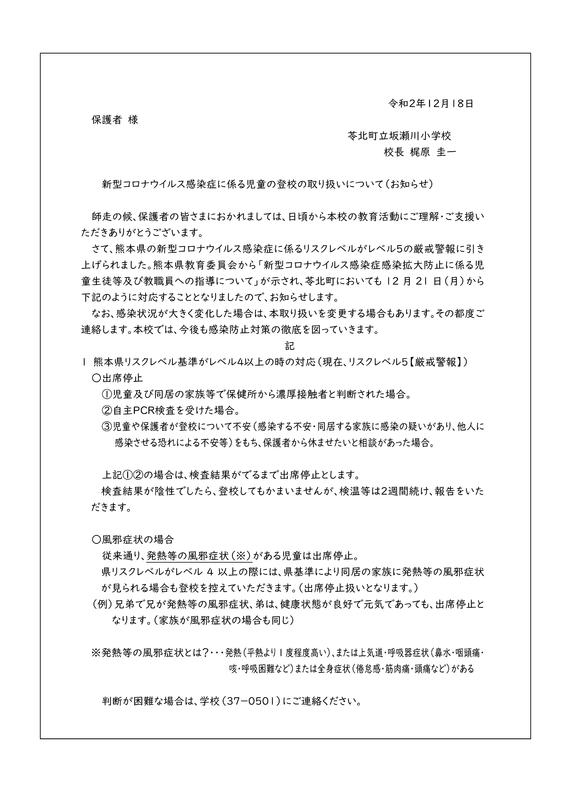 苓北町においても、12月21日(月)より、以下のように対応することとなりましたので、ご理解並びにご協力の程、よろしくお願いいたします。なお、学校でも一層感染防止対策に努めてまいります。