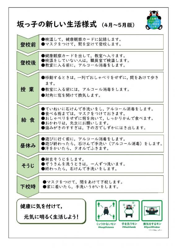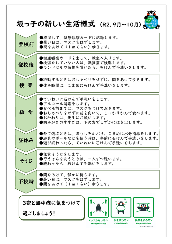 外出時の感染防止対策を徹底するとともに、新しい「坂っ子の新しい生活様式」を守りながら、意識を高めていくことが必要かと考えます。本校教職員も一層気を引き締め、子供たちとともに、しっかりと感染対策を行っていきます。引き続きご協力をお願いいたします。
