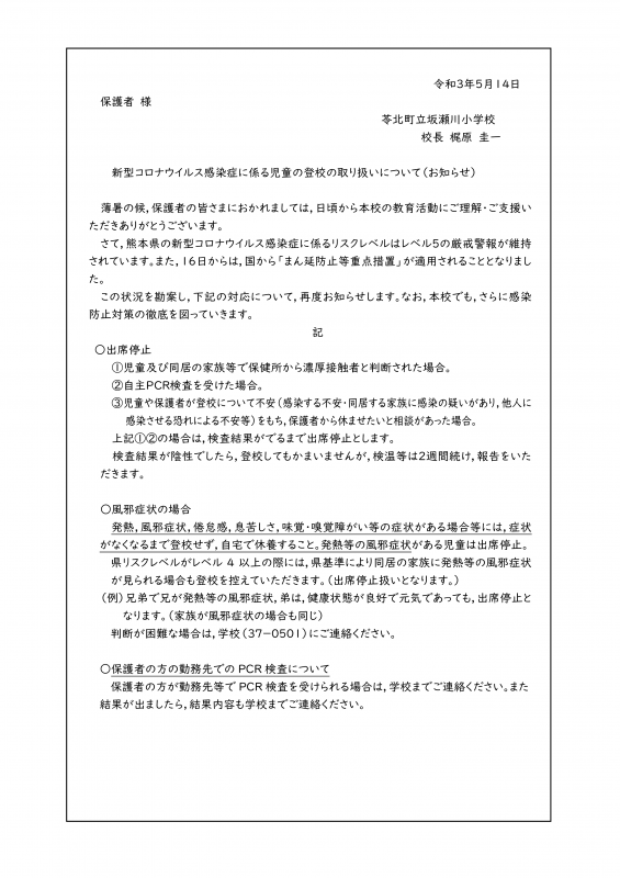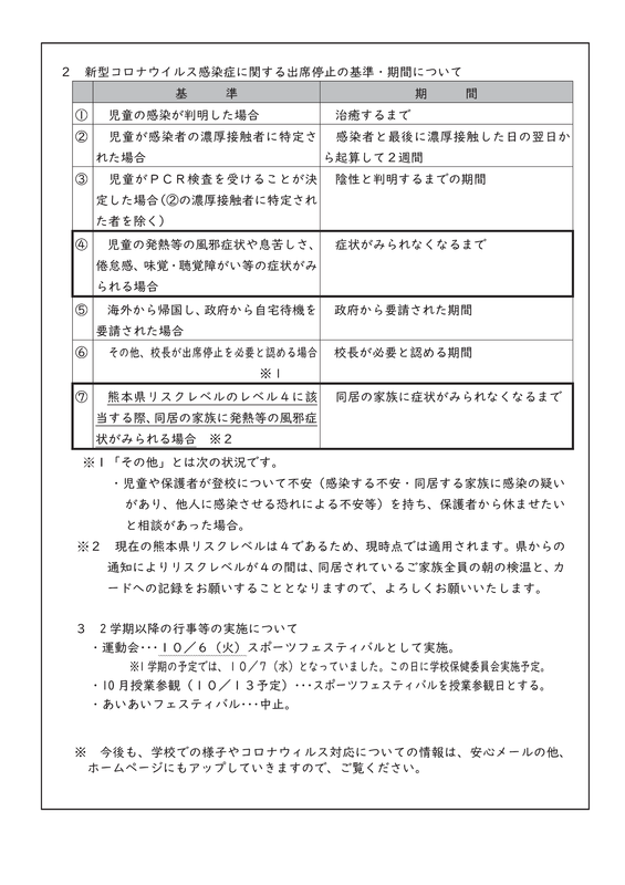 なお、「新型コロナウイルス感染症に係る児童の登校の取り扱いについて(お知らせ)」を再度配布しております。ご確認いただきますよう、お願いいたします。