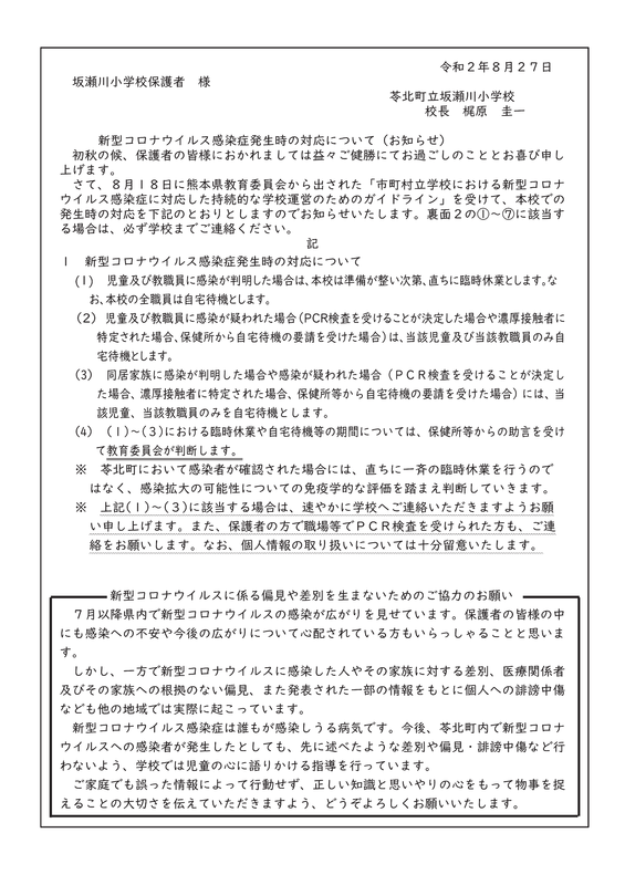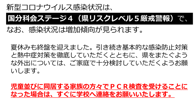 人の往来が盛んになる時期ではありますが、県をまたぐような外出については、ご家庭で十分検討していただくとともに、引き続き基本的な感染防止対策と熱中症対策を徹底をお願いいたします。子どもたちが、残り20日ほどの夏休みを元気に過ごしてくれることを心から祈っております。