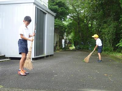 まず6年生が一人ほうきを持って中庭の掃除を始めます。すると、次に1年生が 6年生に習って一緒に掃除を始めました。