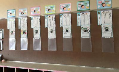 子どもたちの作品を入れる準備ができた後ろの掲示板