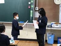5時間目にもうすぐ卒業を迎える6年生に対して、中学校へ向けてエールを送る話をさせてもらいました。夢を持って努力することが、一日一日を充実させることにつながるという内容を、自分の経験談などを交えながら話しました。話し終わると、6年生から思いがけないプレゼントをいただきました。「賞状」と書かれた紙には、6年生と何気なく過ごしたときのエピソードが綴られていました。「六年間で一番楽しかった校長先生との毎日は、決して忘れません。」という言葉に、感激しました。この賞状は、私の一生の宝物です。ありがとう 6年生!