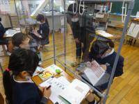 3時間目に2年生算数「九九のきまり」の研究授業が行われました。これまでの学習を通して子供たちが発見してきた「きまり」を活用しながら、答えの見つけ方を説明するという内容でした。きまりも、「たすたす方式」「ふえふえ方式」「入れかえ方式」「分け分け方式」といったネーミングがついていました。一人一人がいろいろな方法で答えにたどり着き、その方法を友達に紹介していきました。新型コロナウイルス感染防止対策として、アクリルボード越しに一生懸命説明する姿が印象的でした。