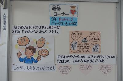 1・2年生は、生活科の学習で学校園にジャガイモやエンドウ豆、大根などを育てています。学校園は、地域の方にご協力いただき、耕していただいています。また、植え方なども丁寧に教えていただきました。子供たちは水やりをしたり、草取りをしたりしながら世話をし、収穫する日を楽しみに待っていました。