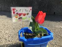この時期は一雨ごとに暖かくなるといいますが、学校で育てている花々も彩りを増してきました。1年生が一人一鉢で育てているチューリップの花が、きょう一輪咲いていました。朝はつぼみが膨らんだ状態でしたが、昼には花が開いていたそうです。とてもうれしそうな顔が印象的でした。