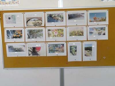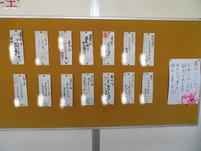 学校の様子を紹介します。5・6年生の掲示板です。国語で学習した作品が掲示されています。身の回りで感じる「春」を俳句や短歌の形式で表現しています。また、春を感じる場所を写真で表現しています。それぞれに捉え方があり、見応えがあります。昨年を思い出して6年生も挑戦しています。