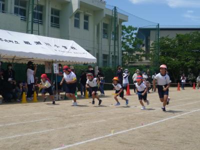 本年度の運動会は,新しい試みで「縦割り班対抗形式」をとっています。自分の班の勝利のために,どの子供も本気モードで力走しています。