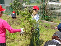 春の陽気で学校の花々が元気に咲き誇っていますが、その分、草もずいぶん伸びてきました。1・2年生が生活科で使う学習園がありますが、その学習園にも雑草がずいぶん生えてきました。本年度も、季節に応じた様々な野菜などを育てるため、1・2年生が力を協わせて草取りをしました。進級した2年生が、1年生に手本を見せようと頑張っている姿を見て、感動しました。今年は何を育て、みんなで収穫を喜び合うのか、今から楽しみです。