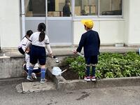 朝から子どもたちの様子を見ていると、1年生が学級園に植えた花の世話をよく頑張っています。毎日、如雨露に何度も水を入れ、水かけをしています。1年生の会話を聞いていると、「ここの花がのどが渇いているよ。」と話ながら水をかけていて、何となく心が温かくなります。水くみをしている時に、靴に水かかかってしまうこともありますが、何となく折り合いを付けながら作業しています。自分たちの所だけでなく、他学年の学級園にもたっぷり水をかけてくれています。そんな1年生の姿を見ながら、1年生なりに「考動力」や「かかわり合う力」がしっかり身に付いてきていることを感じ、うれしい気持ちになります。