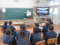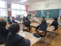始めに始業式を行いました。今日はかなり冷え込んだので、リモートで行いました。本校は内容が校長講話のみです。本日配付の学校だよりに話の内容を載せています。冬休みのくらしの振り返りをしてから、今年頑張ってほしいことを伝えました。