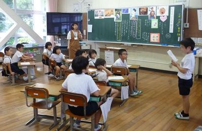 今日は、1年生が教室を飛び出し、国語で学習した「おむすびころりん」を3年生の前で音読発表しました。