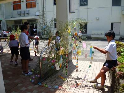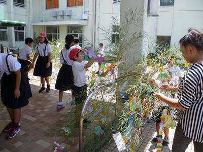 さて、坂瀬川小でも先週 子どもたちと先生が全員お願い事を書き、七夕に向けて飾りつけをしました。