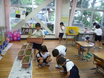 1・2年生はベランダのプランター等を教室内に入れる作業を頑張りました。