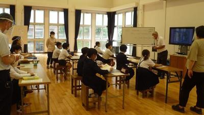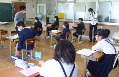 先生方も,町から配付されたフェイスシールドを着用し、授業に臨みます。