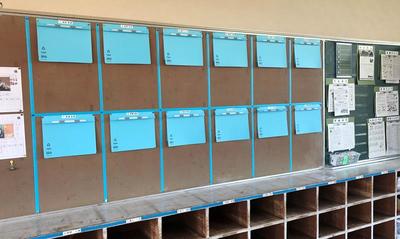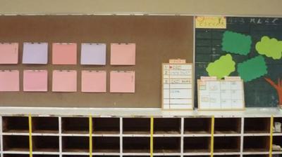 子どもたちの作品を入れる準備ができた後ろの掲示板