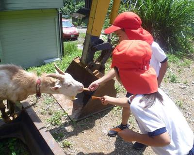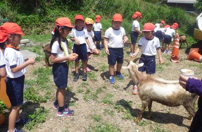 はじめは、おそるおそるえさをあげていた子供たちも、次第に慣れて3頭のやぎの周りに行列をつくっていました。