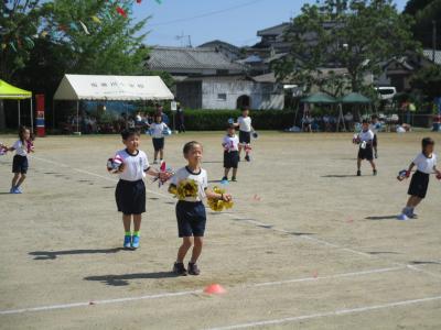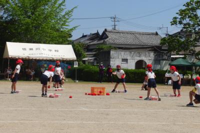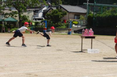 1~3年生の団体競技は,玉入れです。これまでの玉入れとは違い,ソーシャルディスタンスを考えた玉入れとなっています。中央の黄色い箱にねらいを定めて,懸命に球を投げ込んでいます。