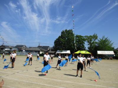 4~6年生の表現「振煉戯」は,「鬼滅の刃」のBGMに合わせて,一糸乱れぬタイミングで旗を振ります。青空と子供たちが振る青い旗が,絶妙のコントラスト創り出しています!