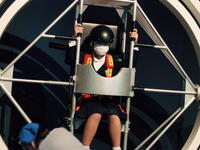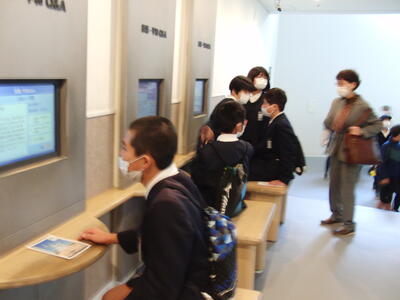 その後、宇宙科学館に向かいました。昼食を取った後、館内のアトラクションを楽しんだり、展示物を見学したりしながら楽しく過ごしました。ムーンウォークや無重力体験のコーナーでは、「緊張する。」と言いながらも、笑顔で体験する様子が見られました。宇宙科学館で最後のお買い物をし、口之津港へ向けてバスに乗り込みました。