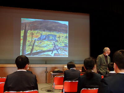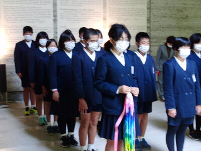 午後からは、追悼平和記念館での平和集会を行い、長崎に落とされた原子爆弾の被害に遭われた方々に対して哀悼の気持ちを込めて黙祷するとともに、持参した千羽鶴を捧げました。その後、被爆体験をされた方の講話を聞きました。当時の長崎市内の様子や被害に遭われた方々の苦しみを聞き取る中で、涙ぐみながら聞いている子もいました。代表児童が感想を述べたのですが、感極まって言葉が出てこない場面もありました。これまで6年生担任として、数多くの子どもたちと長崎に修学旅行に来ていますが、このような場面を体験したのは、初めてでした。聞いている私も涙が出てきました。6年生の感性の豊かさに感激しました。今回の修学旅行のガイドさんも、このような6年生に初めて出会ったと感動されていました。