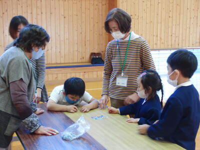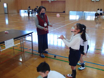 1・2年生は,「昔遊び」を通して,地域の方々とふれあいました。お手玉やおはじき,メンコ,竹とんぼ,輪投げなど,昔からある遊びの方法を教わりました。