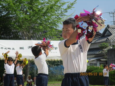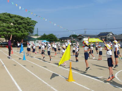 5月22日(日),すばらしい晴天の下で,本年度の運動会がスタートしました。今回は,6つの縦割り班を赤団・青団・黄団の3つの団に分けました。エール交換の内容も自分たちで考えました。