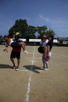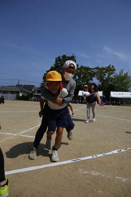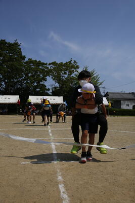 今回は,2年ぶりに6年生と保護者による親子競技も復活しました。おんぶしたりだっこされたりして,6年生の子どもたちはちょっぴり照れくさそうでした。