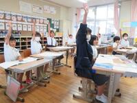 2年生算数。手を挙げる姿勢がいいですね。二つのものの長さについて考えます。