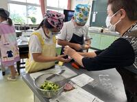 5年生は「ゆで野菜・ゆで卵」、6年生は「いため野菜」の実習でした。子供たちは、普段の自分の食生活を振り返り、緑黄色野菜(緑の食べ物)が不足していることから、工夫してグループで献立を決め、食材を持ち寄り、調理に臨みました。