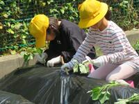芋苗植えは3人の学習支援ボランティアさんにお世話になりました。まず芋苗の植え方を教えていただきました。植えるときに使うとよい便利グッズもご提供いただきました。