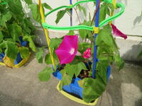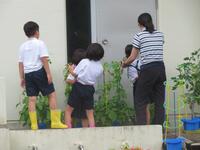 1・2年生はアサガオやミニトマトなどの栽培活動を行っています。登校した後は、じょうろに水をくんで、一目散に畑や学級園に行っています。夏野菜はいくつも実をならせ、子供たちは収穫を楽しみにしています。