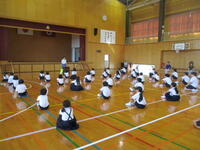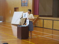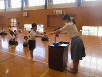 この日は,全員が登校しました。まずはじめに,体育館で,夏休み中に開催された苓北部会水泳記録会での新記録の表彰などを行いました。