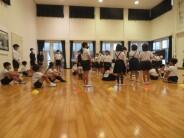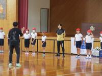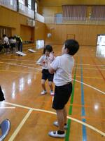 続いて、ボールを使ってゲームを行いました。たっきーはプレイヤー、梅田さんが進行をされました。合図でボールを取るゲームです。たっきー、ボールを取れません。子供たちの方が早いです。